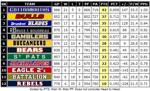 Battalion Bears Boars Bruce Boudreau Buccaneers Bulls Cottonmouths Drunken Blades Gamblers Killer_Rabbits St. Pats Warriors