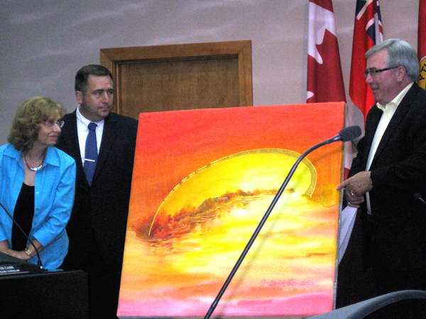 Cornwall - Sep. 13, 2011 - Esther Bryan, creator of the Quilt of Belonging, had a piece of her art shown during the City Council Meeting on Monday September 12th. Her painting will be a part of an exhibt at the London Olympic Games. The Seaway Cultural Arts Committee also presented at City Hall offering their services to help move the Cultural Plan forward. Council also voted 8-2 in favour of the recommendatino that Council establish an Arts Committee To review the Cultural Plan in detail, to invite dialogue with regional partners, and to determine the best course of action for the City of Cornwall to take regarding the recommendations contained in the report.