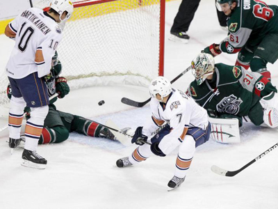 Edmonton - November 4, 2012 - It may have taken them a little time to get used to their surroundings but the Edmonton Oilers Jordan Eberle and Ryan Nugent-Hopkins continued their recent resurgence, scoring all three of Oklahoma City's goals but it wasn't enough, as the Barons fell 4-3 to the Houston Aeros in a shootout.